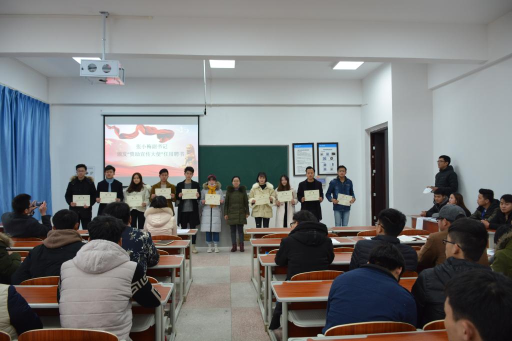 张副书记倡议此次聘任的“国家励志奖学金宣传大使”带动身边更多的贫困员工,在寒假开展“十九大精神”宣讲实践活动,以感恩之心回报国家关爱,力所能及地为家乡发展、为乡村振兴、为美丽中国建设做贡献。同时,希望受聘“国家励志奖学金宣传大使”的同学们在宣讲工作中积极创新方式方法,常发声、发好声,成为有思想、有温度、有情怀的宣传大使,让全社会更好地了解国家资助政策,从而助力国家扶贫攻坚和决胜全面建成小康社会。