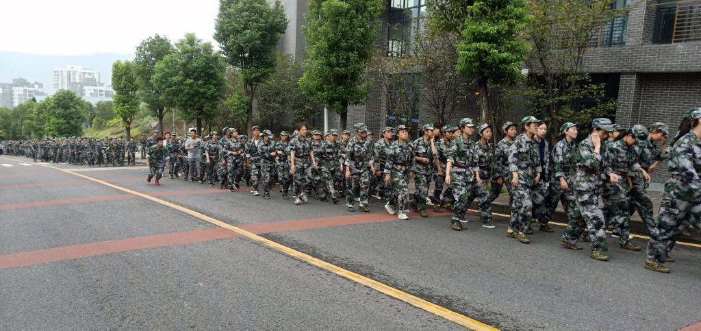 早上8:30,拉练活动正式开始。新生军训拉练队伍从田径场出发,历经一个半小时,最终重回田径场,完成拉练。