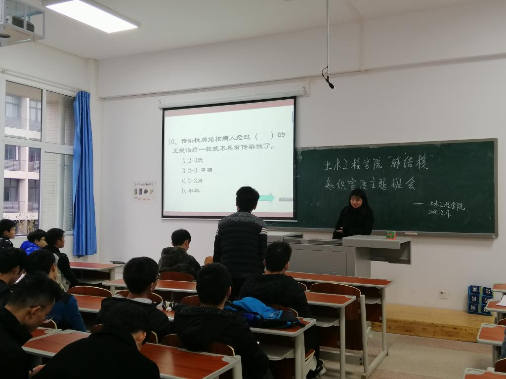 然后,辅导员以肺结核病知识竞答的方式来抽查同学们对肺结核病的了解程度,大部分同学对相关知识掌握良好,消除了对肺结核的误解。最后,辅导员提醒大家从生活中的小事进行疾病预防,尤其是保持宿舍和教室的通风,加强身体锻炼,提高自身免疫力。