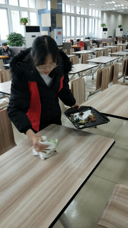 活动中,志愿者们统一着装,意气高昂,兴致勃勃,表示愿意为一个更加清洁的教室、一个更加美好的校园奉献自己的一份力量。在教室,志愿者们自带打扫工具,擦黑板,清理桌兜,扫地,拖地,整理讲台……同学们相互配合,认真劳动,积极为同学们提供一个良好清洁的学习环境;在食堂,志愿者们主动投身收残、清洁餐桌、整理餐盘等工作岗位,认真细致,积极为全校同学营造一个良好的就餐环境。