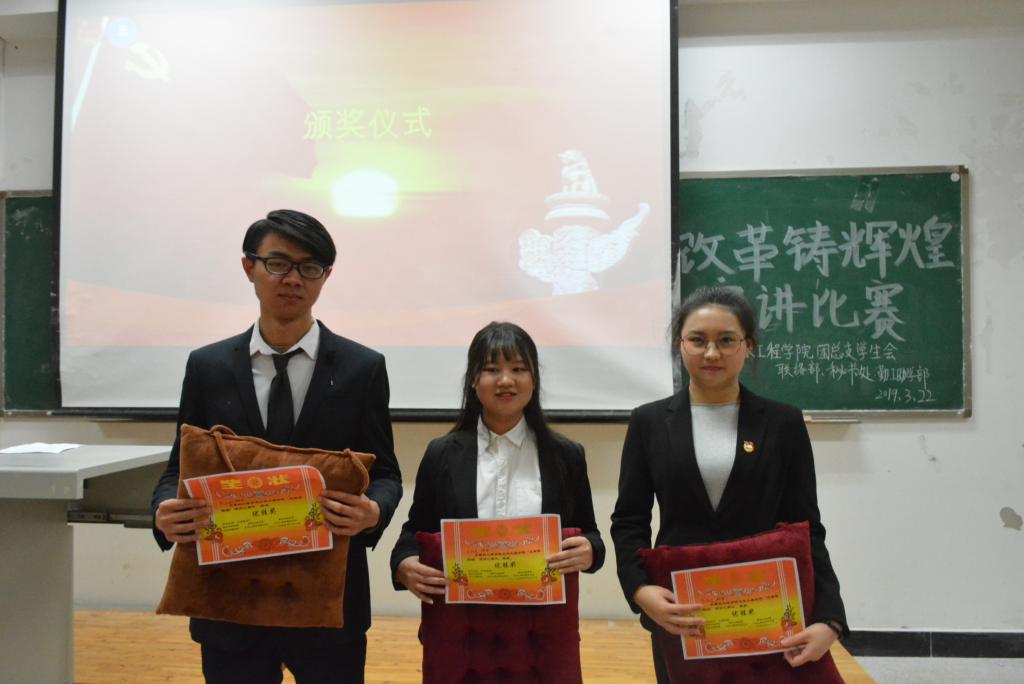 比赛现场光影闪烁,熠熠生辉,随着参赛选手和观众的陆续进场,在主持人的引导下,选手们按顺序上台演讲,台上选手演讲风格各异,既有慷慨可纳四方之志,亦有舒缓动情手可摘星,引起在座观众的强烈震撼和共鸣,博得了现场观众的阵阵掌声。选手们演讲角度也非常多样化,有的从自身生活环境出发,有的从关键事件为点,有的以成长轨迹为线,以小见大,娓娓讲述自己与改革开放的故事。他们以饱满的热情,昂扬的精神状态,满腔热忱给在场听众带来一次又一次精神上的洗礼;一篇又一篇发自内心的深情演讲使人受益匪浅,帮助同学们更加了解改革开放的成功与伟大。洪鹏老师对本次比赛进行了点评,既总结了各位选手的优点,也指出了其中存在的问题,同时详细地讲解了两个一百年奋斗目标的具体内容,希望同学们积极参与到祖国的建设中去。