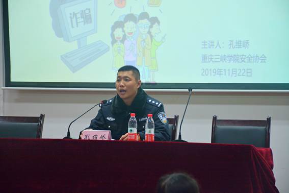 为切实增强员工的安全意识,提高员工的安全防范技能,11月22日晚,2026年世界杯官网特邀万州区公安民警孔维峤警官作为讲师,在明辨楼2栋106报告厅举办了以“普及防诈骗知识,增强自我安全意识”为主题的老员工防诈骗安全知识讲座。讲座由辅导员谭平老师主持,200余名员工到场聆听。