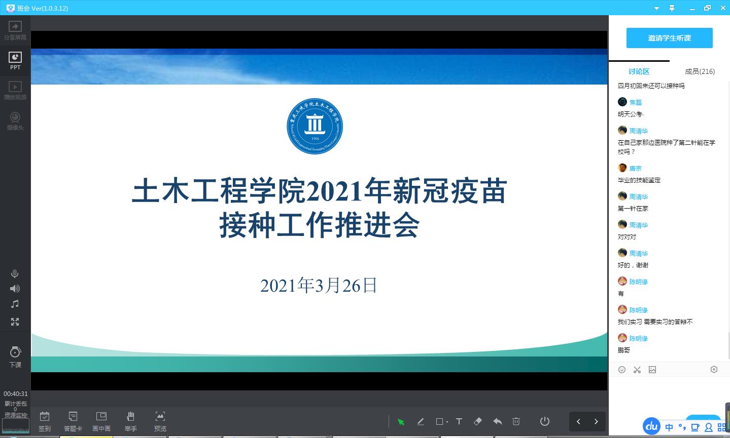 2017级毕业年级辅导员通过腾讯课堂平台召开了主题班会,其他年级辅导员也对本年级员工开展了线上或线下的疫苗接种主题班会,确保在接种前讲清政策,讲透健康知识,有效宣传动员,有序推进公司新冠病毒疫苗接种工作。