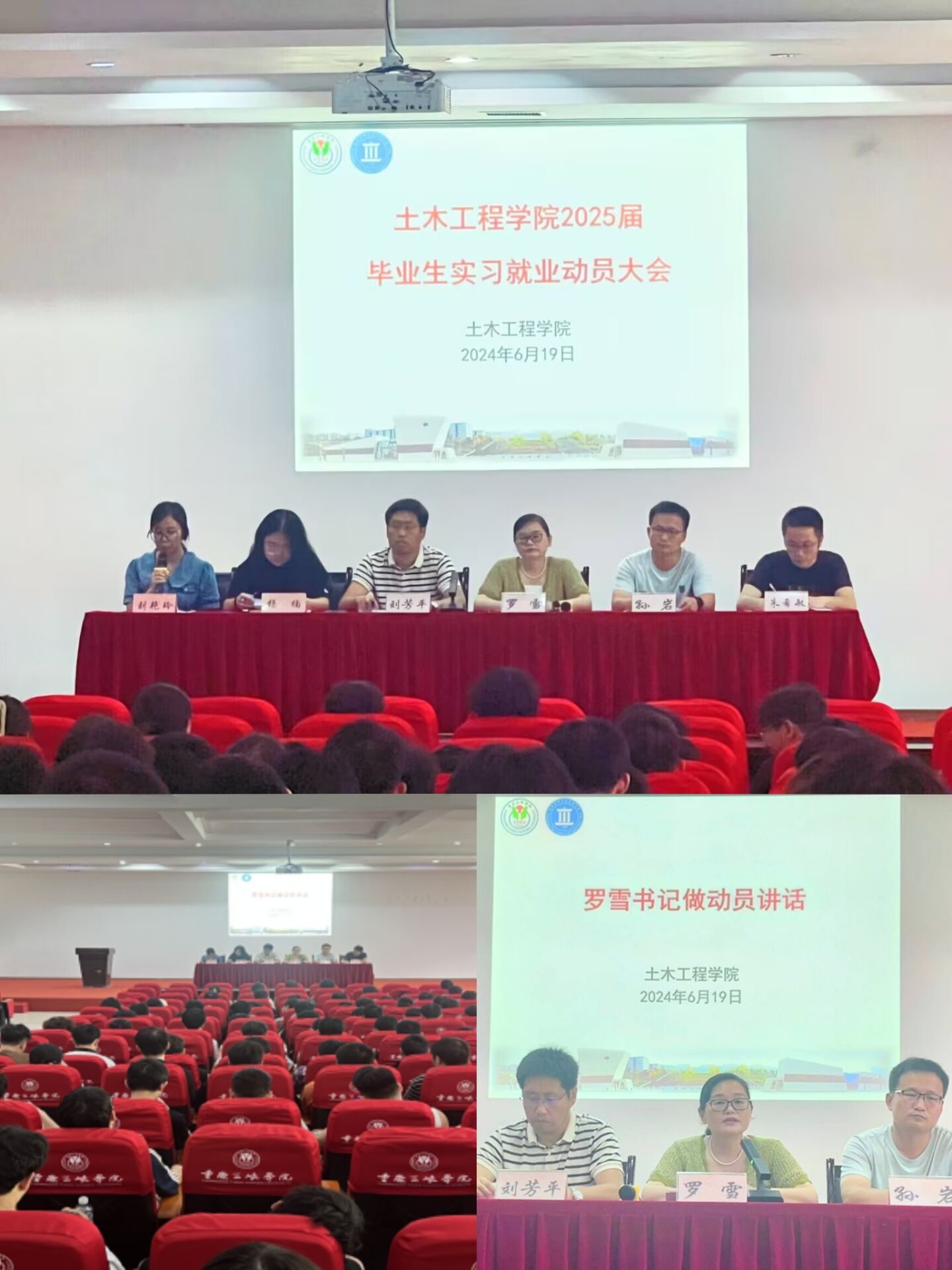 罗雪作实习就业动员讲话。她表示,毕业实习作为大学学习的关键环节,也是毕业生走向社会的重要起点,同学们应充分把握这次机会,全面提升综合素质,展示土木学子风采。她要求:一是勤学慎思,注意安全,保质保量完成实习;二是认清形势,摆正心态,树立实习+就业系统思维;三是吃苦耐劳,担当责任,提升适应社会能力。针对就业她重点强调:一是克服自身不足,明确自身定位;二是抢抓就业机遇,化被动为主动;三是调整就业心态,先就业再择业;四是做好求职准备,以不变应万变;五是用好各类资源,学会寻求帮助。