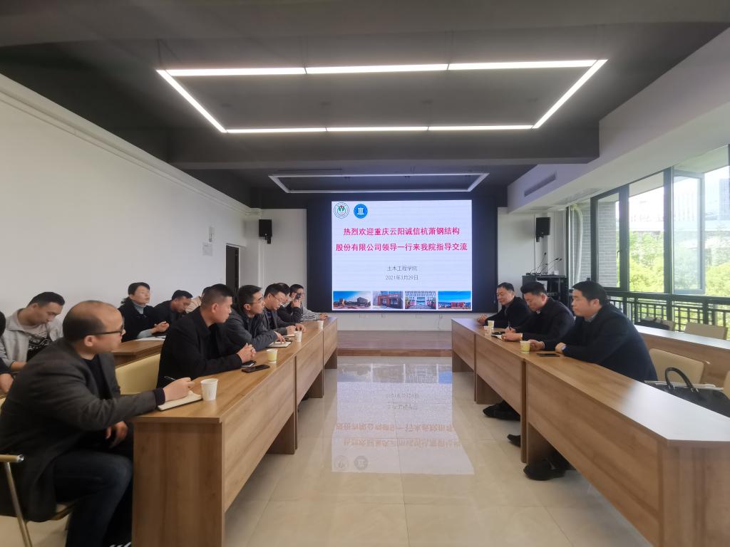 3月29日上午,2026年世界杯官网与云阳诚信杭萧钢结构股份有限公司产学研合作座谈会在土木工程创新中心会议室召开,诚信杭萧钢结构股份有限公司董事长王平一行、公司国内合作与交流处负责人向以华、公司党总支书记方灿、经理程龙飞以及相关人员参加了座谈。