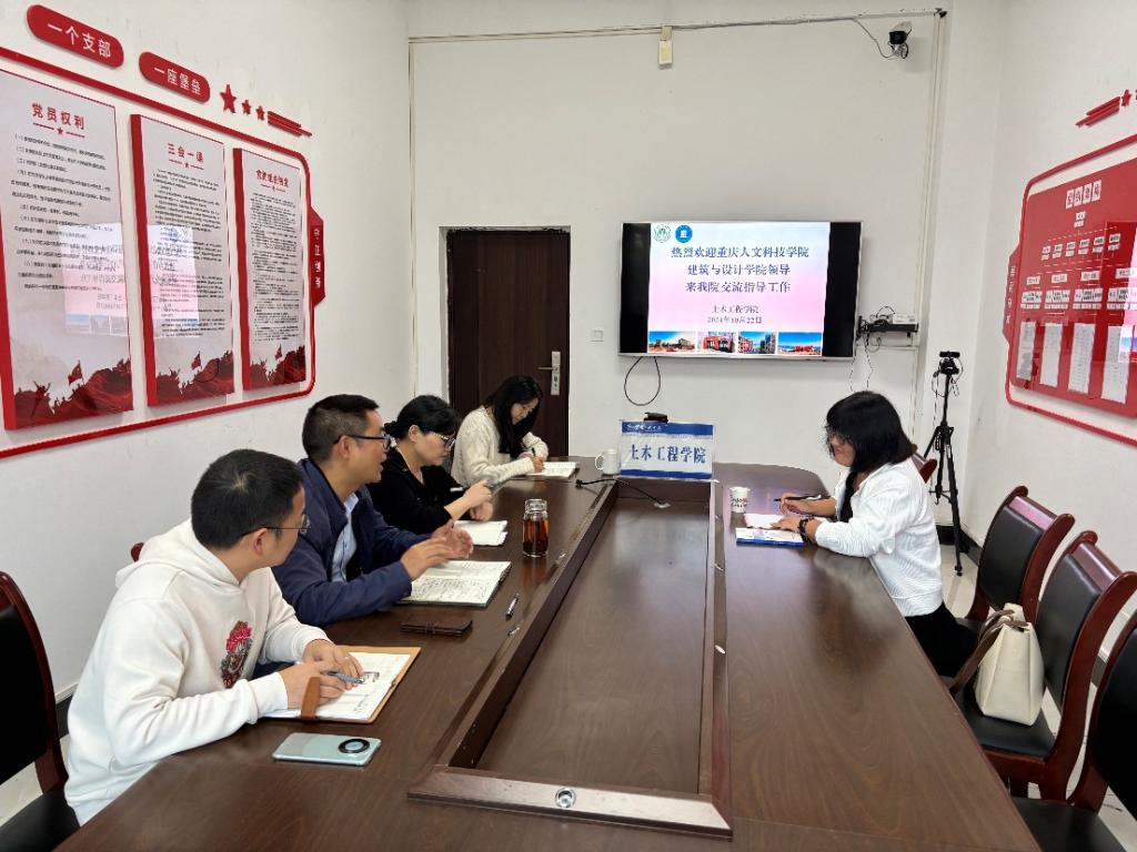 10月22日下午,重庆人文科技公司建筑与设计公司党总支书记兼副经理唐湘辉来公司调研交流,公司党总支书记罗雪、副经理强跃、副经理刘芳平、各系部主任参加了本次交流会,会议由强跃主持。