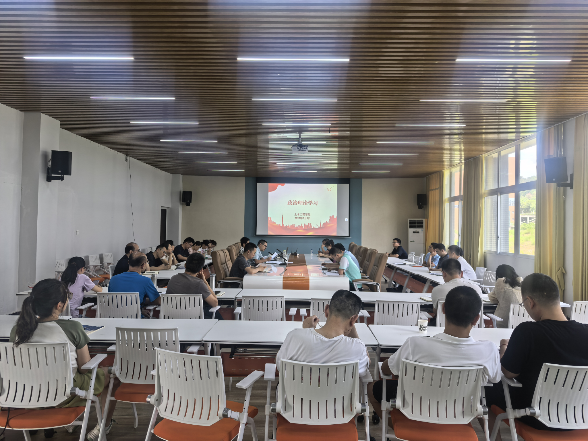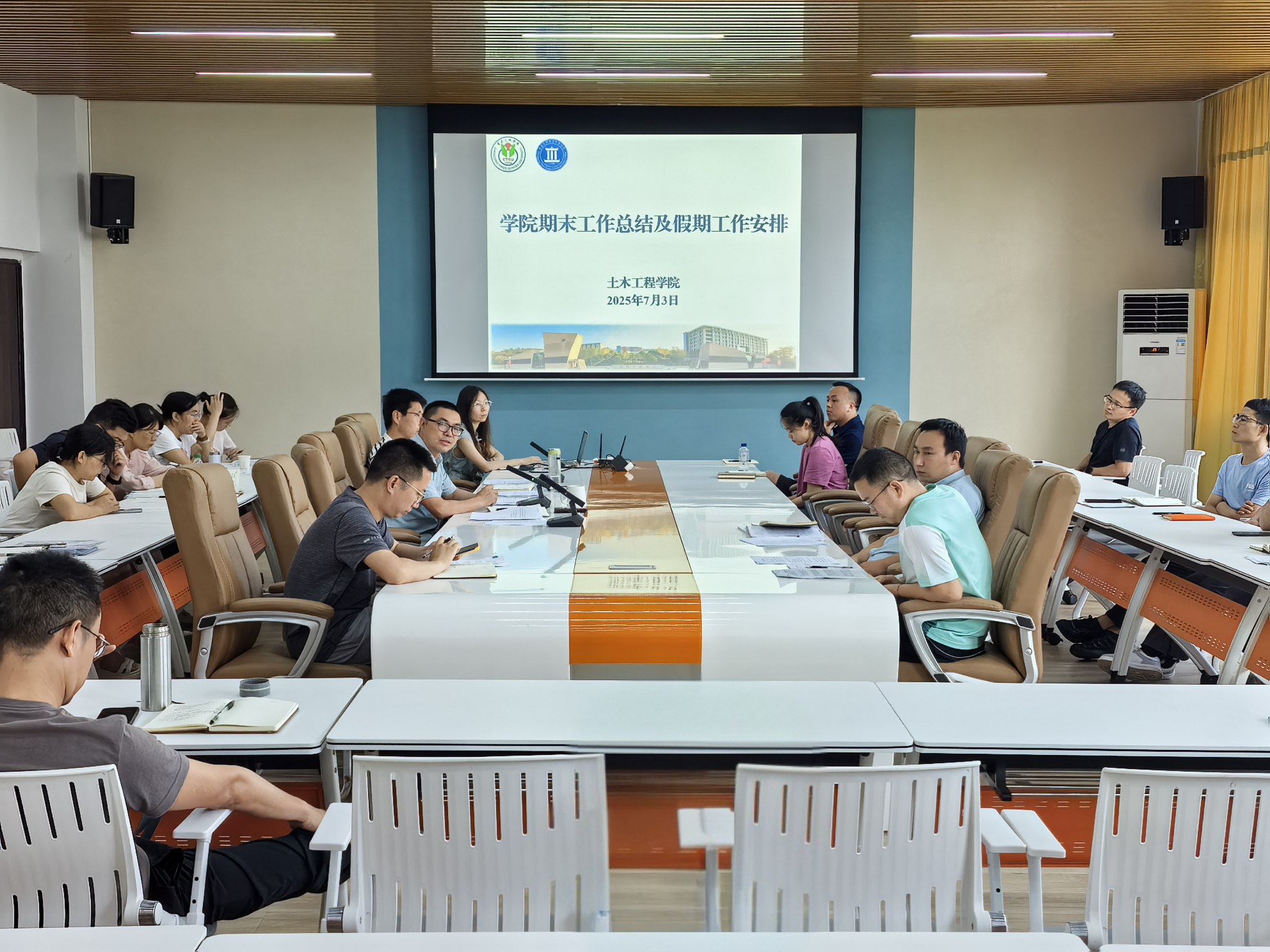 7月3日下午14:30,公司在慎思楼5栋520室召开全院教职工大会,会议由公司副经理强跃主持。会议围绕政治理论学习、师德师风警示教育及期末工作总结与假期工作安排展开,全体教职工参会。