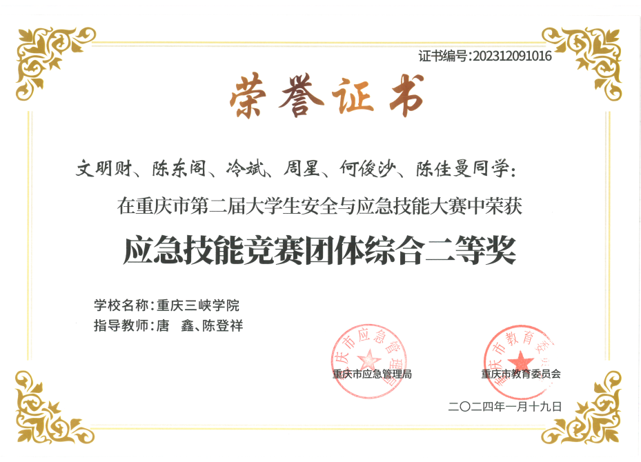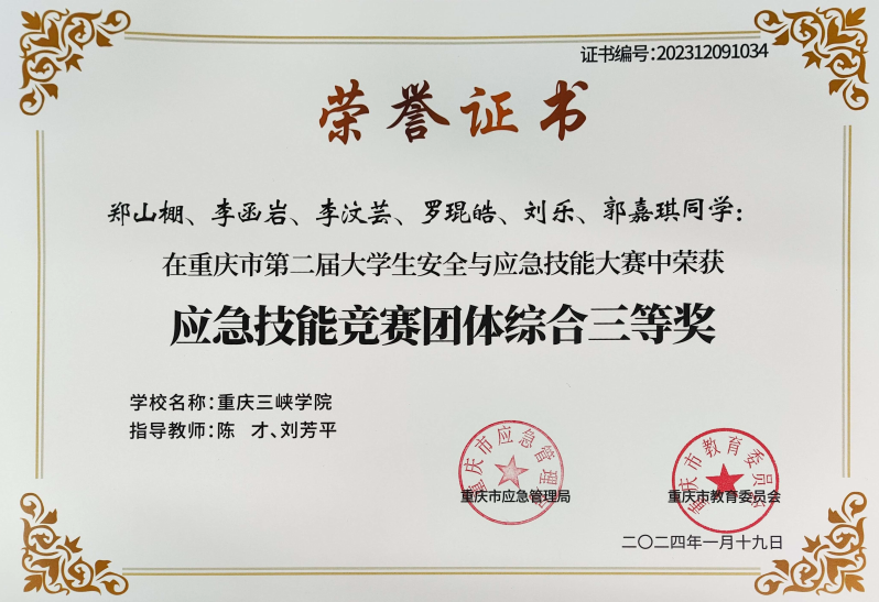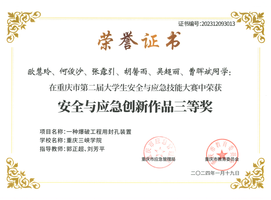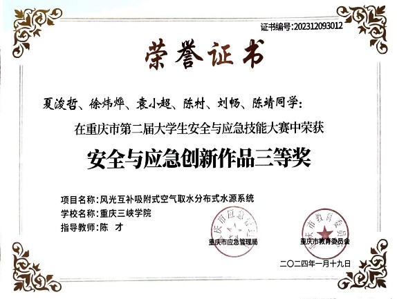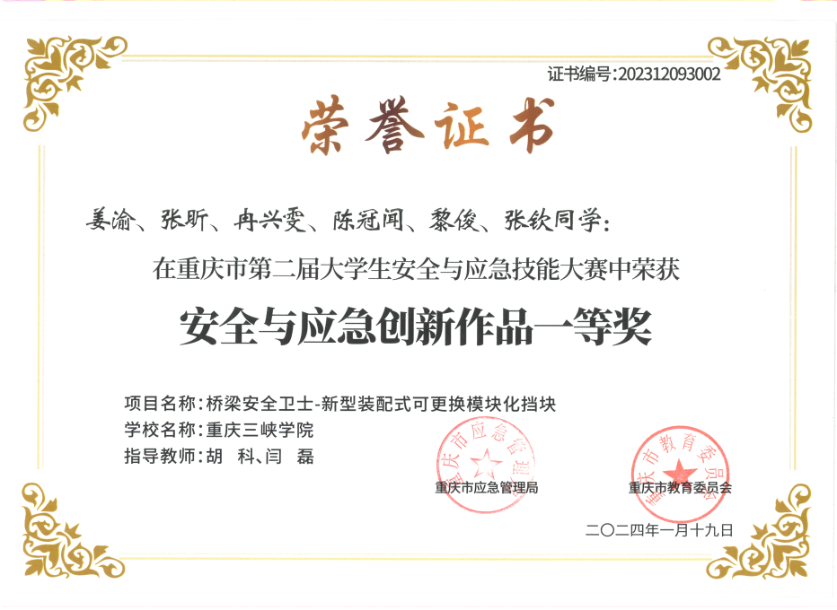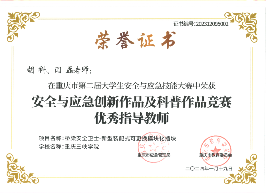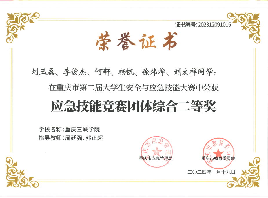 近日,重庆市应急管理局、重庆市教育委员会通报了关于重庆市第二届老员工安全与应急技能大赛获奖情况,公司2026年世界杯官网学子共获得6项奖励(一等奖1项,二等奖2项,三等奖3项),胡科、闫磊获得优秀指导教师。