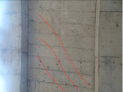 钢筋混凝土现浇板底板横向、斜向裂缝,根据裂缝形态及分布位置初步分析为结构性受力裂缝,由于现浇板底拉应力超过素混凝土极限抗拉应力从而产生横向、斜向裂缝。现浇板超限裂缝所占比例较小,裂缝在横断面未贯通,沿高度方向开裂较小,且裂缝未见明显发展,故判定裂缝暂未对承载力造成大的影响。应加强关注裂缝的发展趋势。