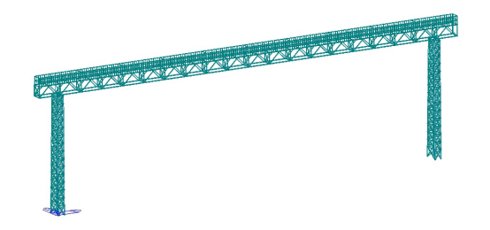 仿真分析案例位于山东省莱芜市某铁路货运站点,灯桥是指在铁路场站或车站内横跨股道的桁梁上安装有投光灯等照明设备的门形构建筑物。灯桥由灯柱及主梁组成,灯桥主要材料包括角钢、钢板等。本案例灯桥长60m,主跨54m,左右侧各悬臂3m,灯柱高15.3m。