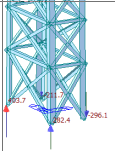 由上图可知,标准组合下灯桥最大竖向位移为-315.8mm,最大横向位移为536.3mm,最大纵向位移为18.41mm,因此灯桥竖向、横向刚度较弱,不满足相关规范竖向L/400、横向L/200的位移要求。