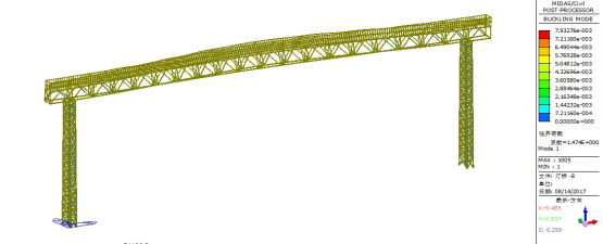 由上图可知,标准组合下原灯桥结构的一阶屈曲稳定系数为1.47,小于经验系数4.0,则灯桥整体稳定性不满足要求。