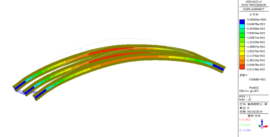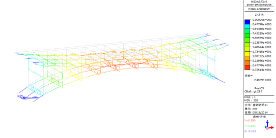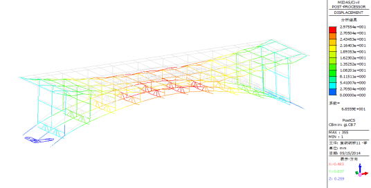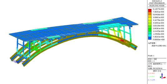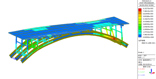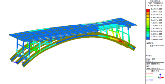 图28成桥阶段偏载2列车工况下全桥一阶屈曲模态(稳定系数:41.01)