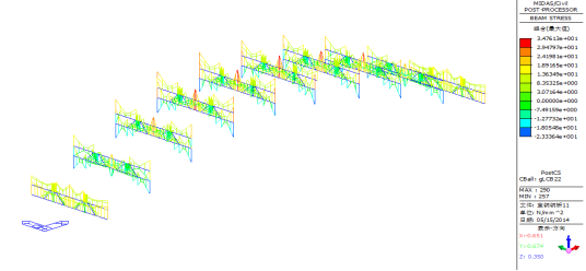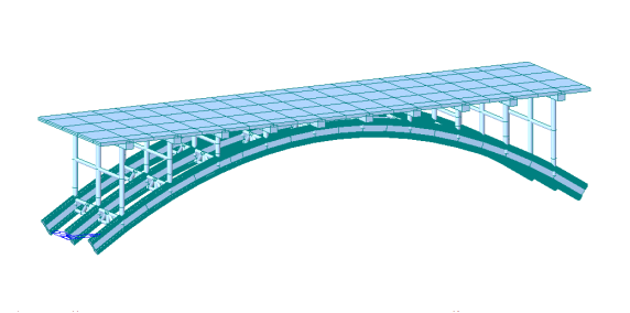建模采用midas/civil2012有限元分析软件,按设计材料类型和截面尺寸建模分析弹性阶段最不利荷载工况下成桥阶段及施工阶段的受力性能;拱肋采用组合截面中的一般截面,梁单元建模,拱肋横撑、立柱及盖梁均采用梁单元建模,桥面板通过虚拟横梁等效为梁格体系,桥面板两端按简支梁体系连接;由于拱脚坐落在原桥基础上,可认为地基状况良好,拱脚均采用墩底固结形式;成桥阶段共划分为421个节点,601个单元,全桥离散图如下所示: