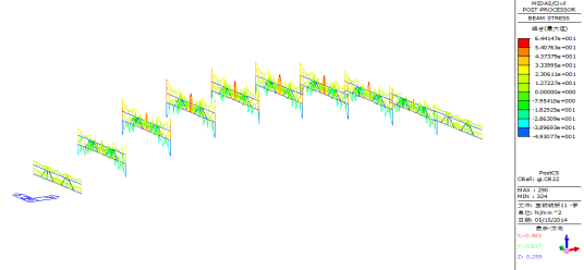 主拱肋上、下缘截面最大应力分别为49.70Mpa和-127.00Mpa,小于Q345c钢板设计强度315Mpa,强度满足要求。