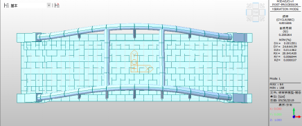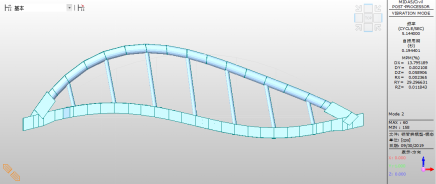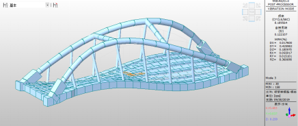 拱桥一阶振型为主拱的横向振动,见图22,一阶振动频率为4.8Hz;二阶阵型为竖向反对称振动,见图23,二阶振动频率为5.144Hz;三阶振型为反对称扭转振动,见图24,振动频率为8.190Hz。
