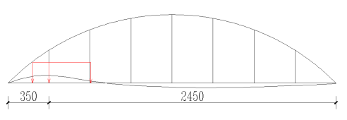 拱肋及风撑:全桥共设两榀钢管混凝土拱,拱肋截面为圆形,直径D=80cm,钢管壁厚为16mm,内充C40微膨胀混凝土;两榀拱肋横向间距为7.7m,拱肋设置2道钢管风撑,风撑截面为圆形截面,直径D=70cm,钢管壁厚14mm。