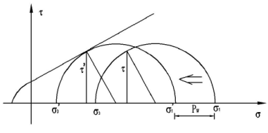 对于库水位上升产生的浮托力对岸坡稳定性的影响分析,可以在滑面上取一微小体,对其进行应力分析,当水渗入滑动面时,在滑面孔隙中产生孔隙水压力,水位上涨使得原本风干的土体浸水饱和,滑动面上孔隙水压力急剧增大,如图7所示,增大的孔隙水压力使得整个莫尔圆向左侧移动,总应力不变,致使有效应力降低,不利于岸坡的稳定。