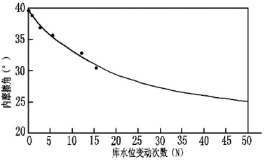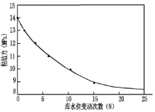 三峡库区自2003年蓄水至135 m,2006年蓄水至156 m,2008年蓄水至最高水位175 m以后,每年库水位在145m到175m之间变化。库区正常运营以后,库岸岩土体经历周期性浸泡。岸坡岩土体会在这种“饱水-风干”的水-岩循环作用下发生岩性裂化,降低其抗剪强度参数,最终导致岸坡稳定性变差。刘新荣等以砂岩为代表岩体,通过室内试验模拟库水位升降作用下水-岩相互作用情况,得出了砂岩在库水周期性浸泡下的劣化规律:砂岩抗剪强度参数随着干湿循环次数的增加而降低,在循环初期,抗剪强度下降速率最大,随着循环次数的增加,抗剪强度减小幅度变缓,逐渐趋于稳定[6],(如图5所示)。