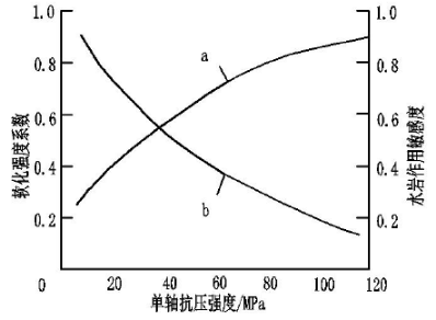 岩土体在干燥与在水下浸泡饱水时的强度差异很大,这种由于水的浸泡导致岩土体强度降低的现象称为软化作用。一般用软化系数来量化软化作用的大小,即岩土体饱和状态时的抗压强度与风干时的抗压强度之比,软化系数越大,表明岩土体越不容易被水软化,反之,越容易被软化。在三峡库区巫山段库岸中,岩质库岸所占比例约为40%,加上岩土混合库岸中,坡脚多为岩质。所以研究岩质库岸在库水中长期浸泡的软化作用非常有必要。各类岩体因其组成矿物的不同以及结构的差异,软化系数也相差较大,对于坚硬的结晶岩强度软化系数能达到0.9以上,而对于泥质岩类这种低强度软岩来说,软化系数普遍在0.7以下,有的甚至低至0.4。岩石对于水的敏感程度和岩石的胶结程度及自身强度密切相关,图3为岩石强度软化的一般规律。
