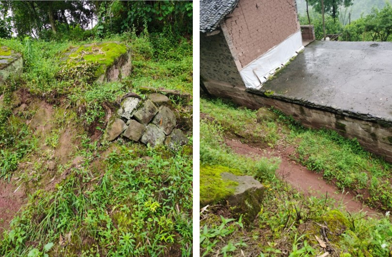 高峰镇柑子林滑坡位于万州区高峰街道洪安村2组。目前秦从安屋后陡斜坡变形区域横宽约30m,纵长约15m,厚约2~5m,约1500m3,为浅层小型土质滑坡,主滑方向为149°,下伏基岩为泥岩,地层产状330°∠4°。主要威胁下方秦从安1户2人居民生命财产安全。该滑坡变形主要表现在滑坡后缘下挫0.2~0.5m,前缘不断滑塌堵塞居民房屋后缘排水沟造成排水沟淤积约1~3m的崩坡积块石土,土体侧压力造成干砌条石房屋局部变形降雨期间不断渗水,坡体表面分布体量5~10m3不等的孤石,易随滑塌体滚落冲击破坏底部居民房屋。