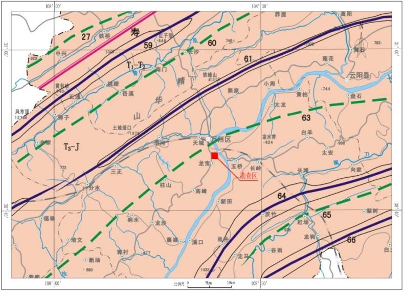 本区域内实测岩层产状:320°∠6°,岩层呈单斜产出,地层连续稳定,结合一般,地层为侏罗系中统上沙溪庙组,岩性主要为砂质泥岩及砂岩。区内新构造运动不强烈,表现为大面积缓慢间歇性抬升,根据本次钻探,无断层﹑构造破碎带通过,区域地质构造上属于稳定场地,区域构造纲要示意图见图2。