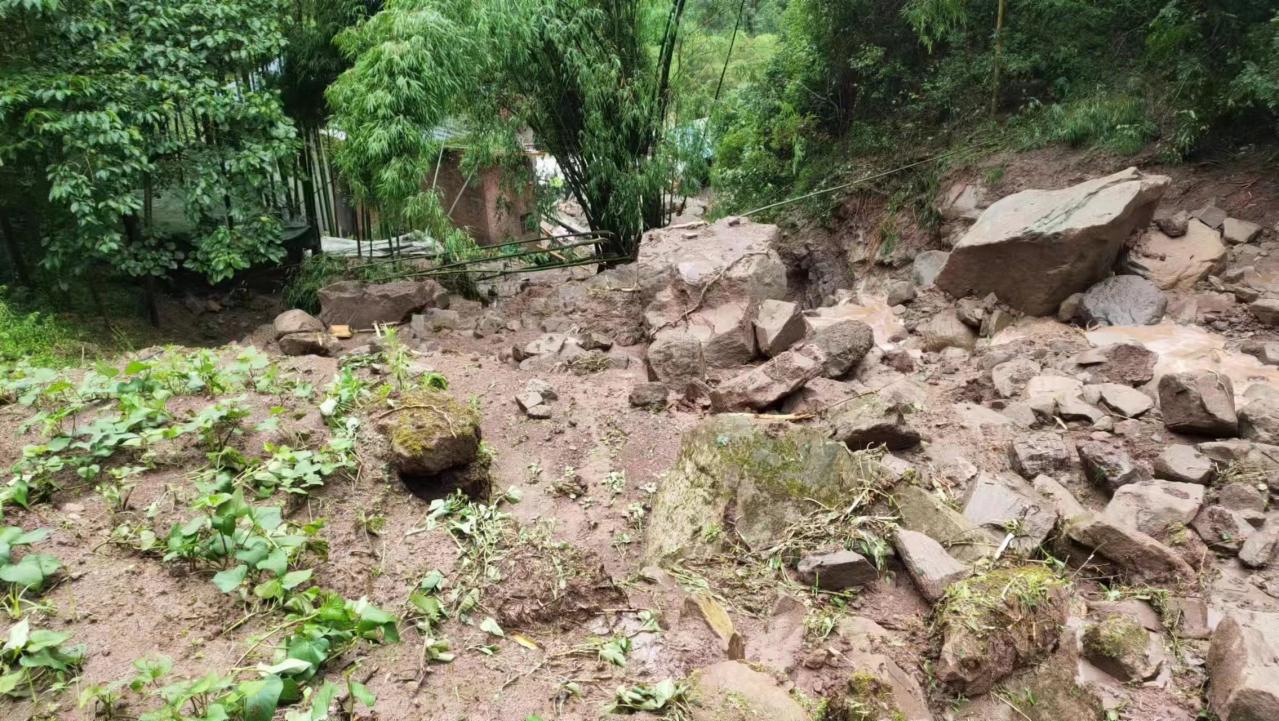该泥石流位于构造侵蚀低山河谷地貌,斜坡属逆向坡,受河流侵蚀坡面形成梳状沟槽,据调查,该泥石流沟流域形态呈狭长的感叹号型,流域纵长长度450m,流域面积900m2。最高点位于北侧近山顶区域,海拔搞成620m,最低点位于坡脚喇叭口,海拔448m。相对高差172m,平均纵坡降382‰。受“7.4暴雨”影响,斜坡上部崩坡积发生滑塌,造成块碎石夹砂土汇流于沟槽形成水石流,造成下部一栋房屋损毁及2人死亡。由于斜坡顶部仍残留较多残坡积,存在进一步滑塌风险,威胁坡脚4户15人(常住8人)生命财产安全。