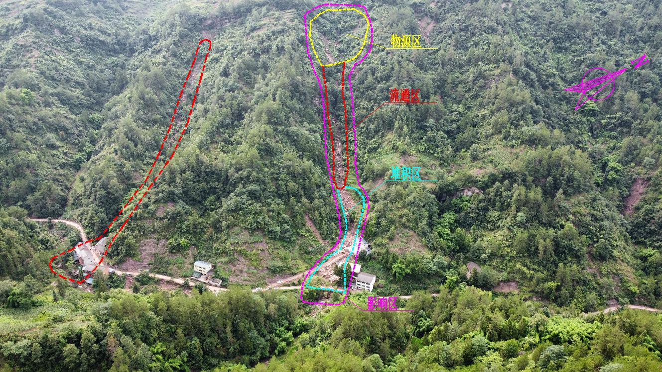 由于目前物源区崩坡积土多处已松动滑塌,岩土参数低,出去基本稳定~欠稳定,再遇极端降雨,可能引发更大规模滑塌变形,并形成泥石流,威胁坡脚堆积区居民房屋。