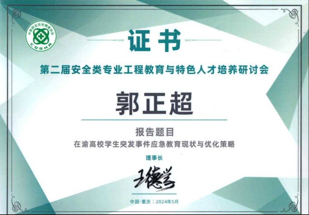 此次研讨会为期两天,采用特邀主题报告与平行分会场报告的形式,公司安全工程教师郭正超受邀做题为“在渝高校员工突发事件应急教育现状与优化策略”的分会场报告,介绍了公司员工突发事件应急教育情况,同与会专家一起探讨高校员工应急教育,受到与会专家的热烈关注与一致好评。