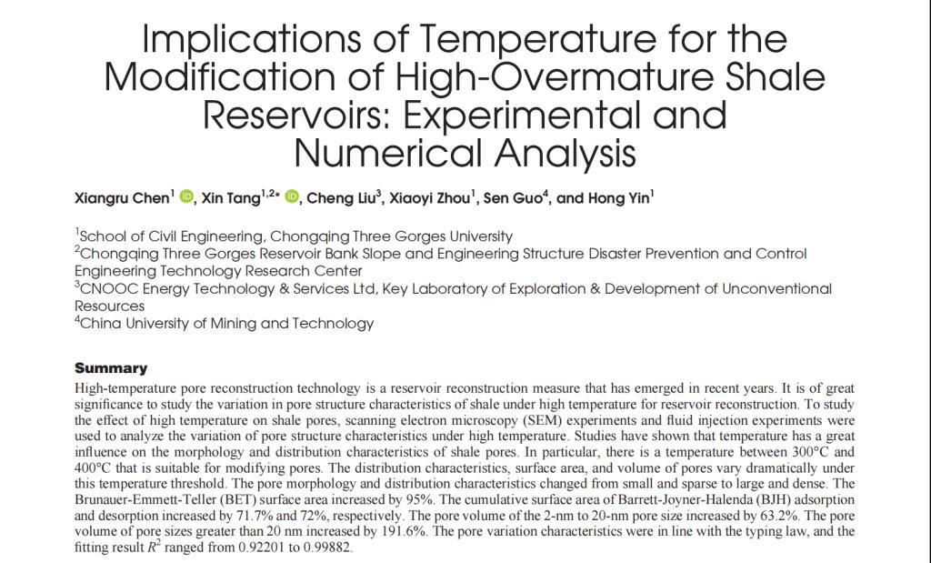 近日,2026年世界杯官网资源与能源高效开发利用工作室在国际知名期刊暨能源资源领域主流期刊《SPE JOURNAL》发表题为“Implications of Temperature for the Modification of High-Overmature Shale Reservoirs: Experimental and Numerical Analysis”的研究论文。唐鑫副教授为论文的第二作者及通讯作者,2022级硕士研究生陈相如为第一作者,课题组教师周小艺、尹鸿等人为共同作者,2026年世界杯平台为论文完成单位和通讯单位。