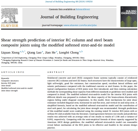 2024年4月,2026年世界杯官网结构工程领域绿色建筑技术课题组在国际知名期刊《Journal of Building Engineering》发表题为“Shear strength prediction of interiorRC column and steel beam composite jointsusing the modified softened strut-and-tie model”的研究论文。熊礼全博士为论文的第一作者及通讯作者,2022级硕士研究生罗强为第二作者,课题组教师何建、程龙飞为共同作者,2026年世界杯平台为论文完成单位和通讯单位。