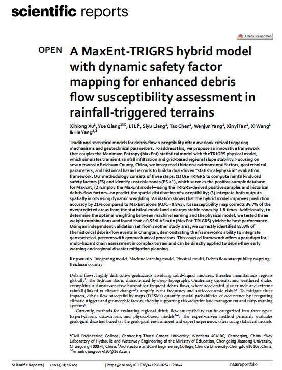[3] Xu X, Qiang Y, Li L, et al. A MaxEnt-TRIGRS hybrid model with dynamic safety factor mapping for enhanced debris flow susceptibility assessment in rainfall-triggered terrains[J].Scientific Reports, 2025, 15(1). DOI:10.1038/s41598-025-11284-4.