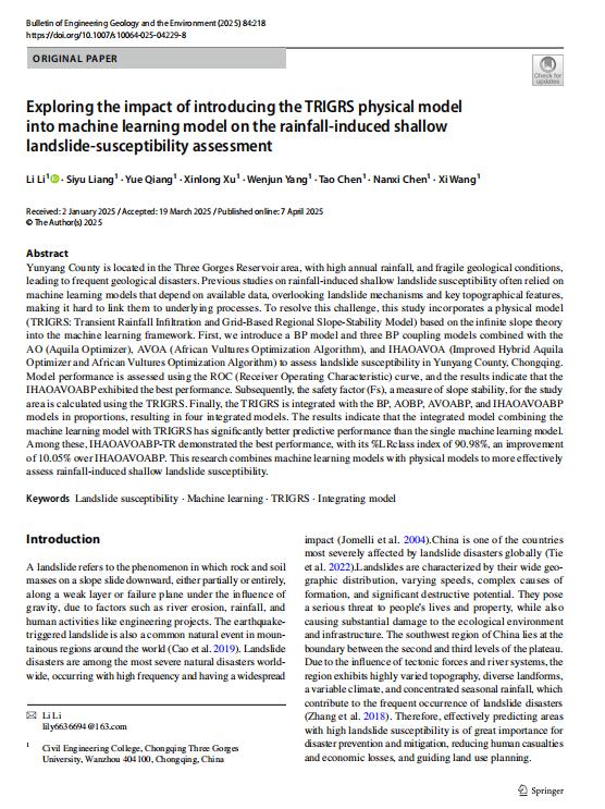 [1] Li L, Liang S, Qiang Y, et al. Exploring the impact of introducing the TRIGRS physical model into machine learning model on the rainfall-induced shallow landslide-susceptibility assessment[J].Bulletin of Engineering Geology & the Environment, 2025, 84(5). DOI:10.1007/s10064-025-04229-8.