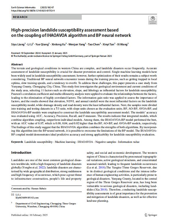 [2] Liang S, Li L, Qiang Y, et al. High-precision landslide susceptibility assessment based on the coupling of IHAOAVOA algorithm and BP neural network[J].Earth Science Informatics, 2025, 18(2):1-20. DOI:10.1007/s12145-025-01753-9.