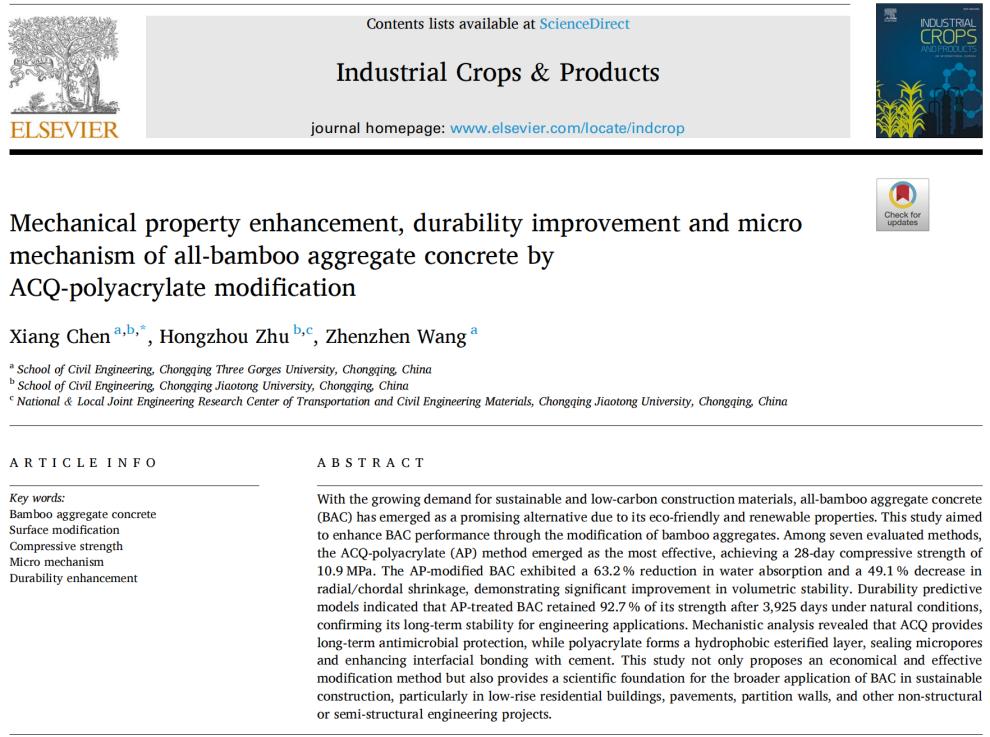 [1]Xiang Chen, Hongzhou Zhu, Zhenzhen Wang.Mechanical property enhancement, durability improvement and micro mechanism of all-bamboo aggregate concrete by ACQ-polyacrylate modification[J],Industrial Crops and Products,2025,228,120947.https://doi.org/10.1016/j.indcrop.2025.120947.