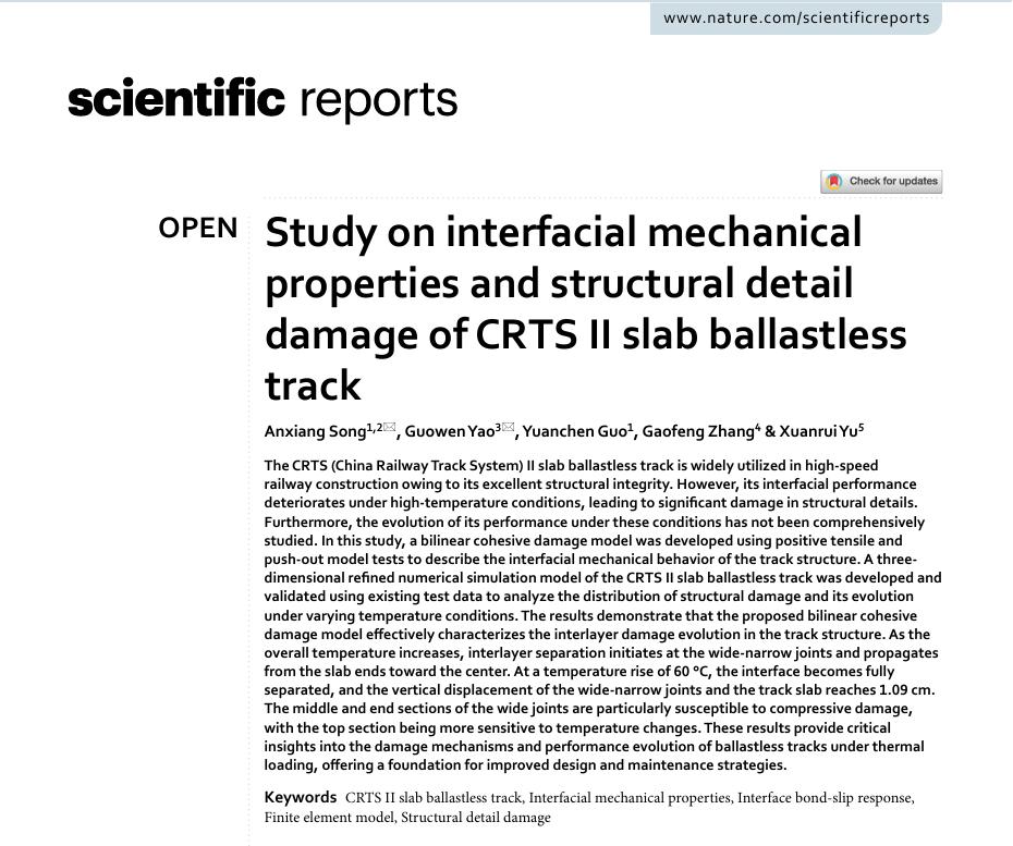 [1]Song, A., Yao, G., Guo, Y. et al. Study on interfacial mechanical properties and structural detail damage of CRTS II slab ballastless track. Sci Rep 14, 31354 (2024).https://doi.org/10.1038/s41598-024-82822-9